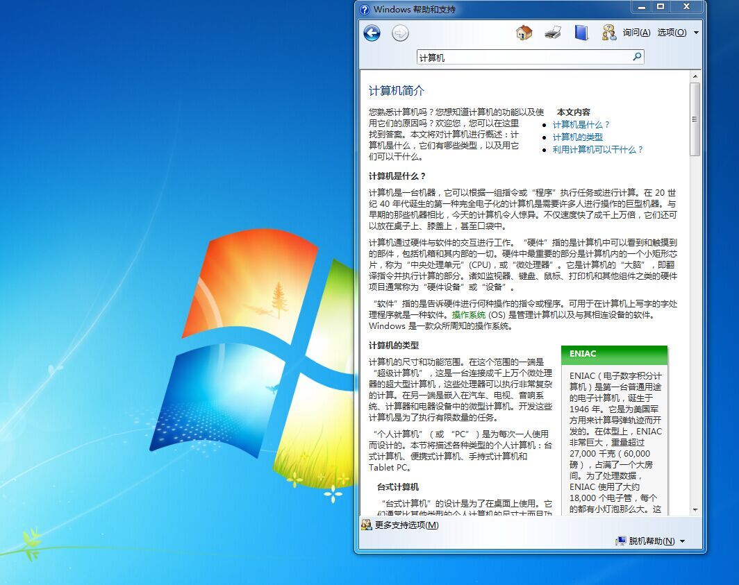 在Windows7桌面任意位置按"F1"键,在弹出的对话框中输入“计算机”;通过Windows7自带的帮助命令学习计算机。