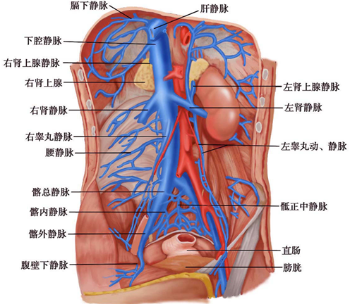 (3)髂总静脉:由髂内静脉和髂外静脉在骶髂关节的前方汇合而成,向内上斜行,至第5腰椎平面,左右髂总静脉汇成下腔静脉。