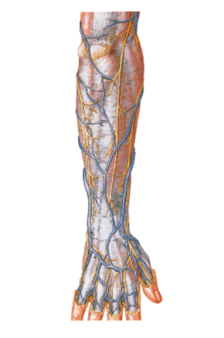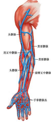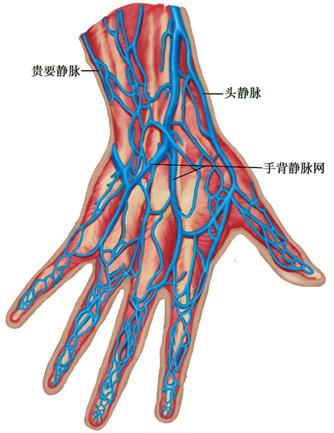 ② 贵要静脉:起自手背静脉网的尺侧,沿前臂的尺侧上行,至肘部转至前面,经肱二头肌内侧沟上行至臂中点平面,穿深筋膜。注入肱静脉或伴肱静脉上行注入腋静脉。静脉较粗,位置恒定、表浅。在此进行静脉穿刺或插管等。