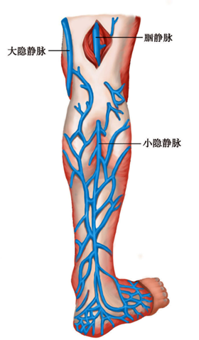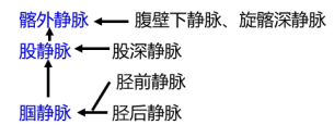 ① 大隐静脉:全身最长的浅静脉,在足内侧缘起自足背静脉弓,经内踝前方,沿小腿内侧、膝关节内后方、大腿内侧面上行至耻骨结节外下方3~100px处穿阔筋膜的隐静脉裂孔,注入股静脉。内踝的前方,位置表浅而恒定,是注射、输液及静脉切开的部位。