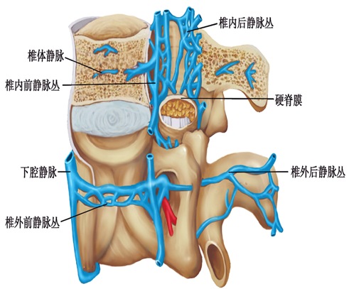 (2)椎静脉丛:位于椎管内、外,纵贯脊柱的全长,包括椎内静脉、椎外静脉。椎静脉丛分别与椎静脉、肋间后静脉、腰静脉交通。向下和盆腔内的静脉交通,向上与颅内硬脑膜窦相通。