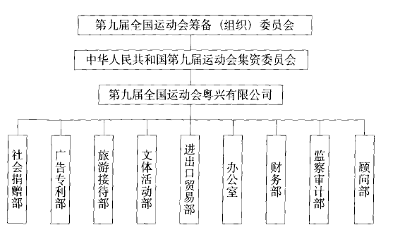 以公司为运作机构的典型案例:第九届全国运动会粤兴公司的组织结构,内设8部1室,其中办公室、财务部、监察审计部、顾问部是按只能设立的部门,社会捐赠部、广告专利部、旅游接待部、文体活动部、进出口贸易部(就是器材采购部)是按照市场开发业务不同性质设立的部门。这个公司直接承担市场开发职能,并接受组委会直接领导。