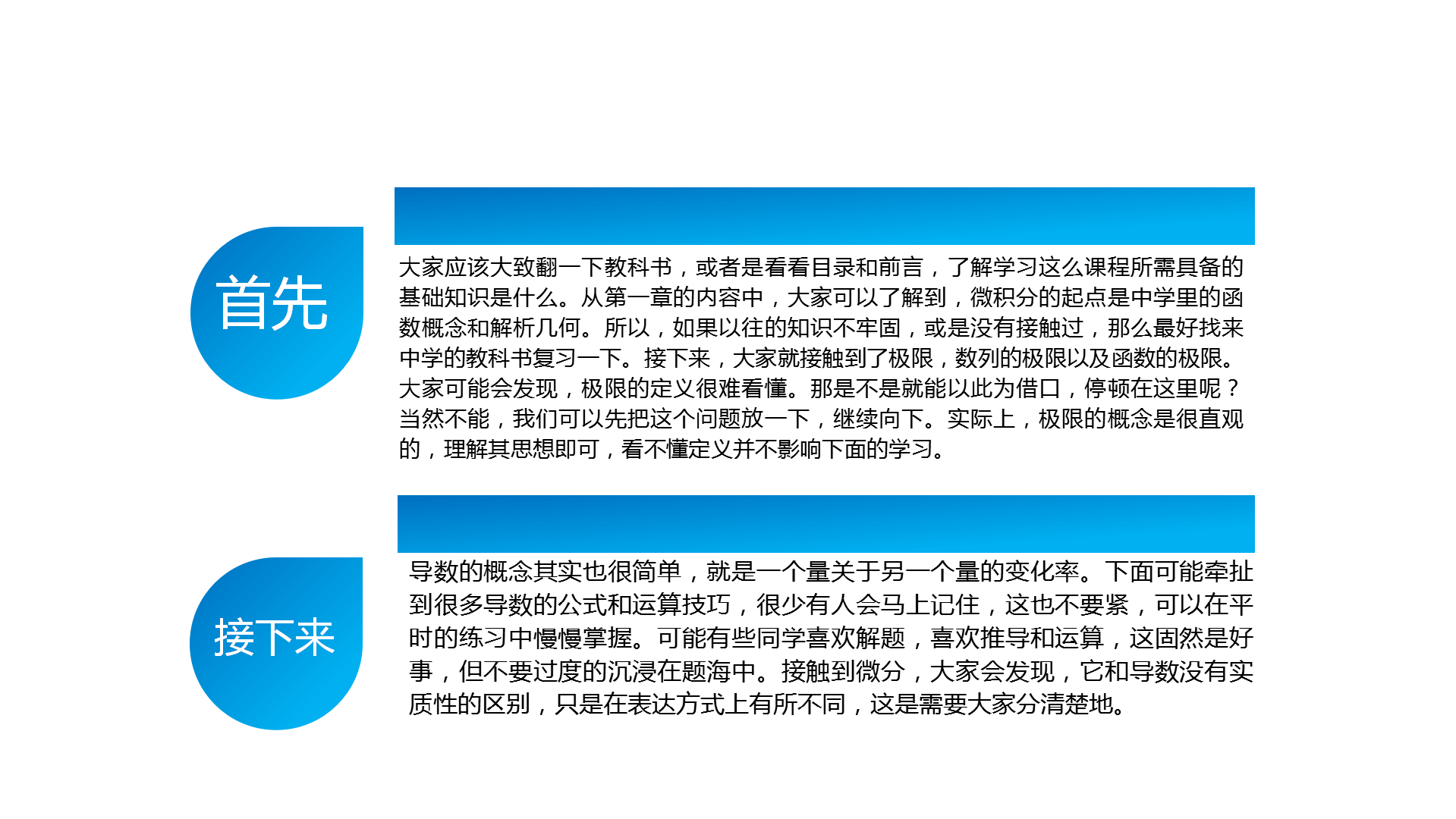 初学者做微积分习题,一是要多“练”(多做上述第一类习题,提高熟练程度),二是要多“看”(看有一定技巧性的题解,从中学习做题方法)。