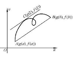 若令u=f(x),v=g(x),这个形式可理解为参数方程,而[f(a)-f(b)]/[g(a)-g(b)]则是连接参数曲线的端点斜率,f'(ξ)/g'(ξ)表示曲线上某点处的切线斜率,在定理的条件下,可理解如下:用参数方程表示的曲线上至少有一点,它的切线平行于两端点所在的弦,这一点Lagrange也具有,但是Cauchy中值定理除了适用y=f(x)表示的曲线,还适用于参数方程表示的曲线。 当柯西中值定理中的g(x)=x时,柯西中值定理就是拉格朗日中值定理。
