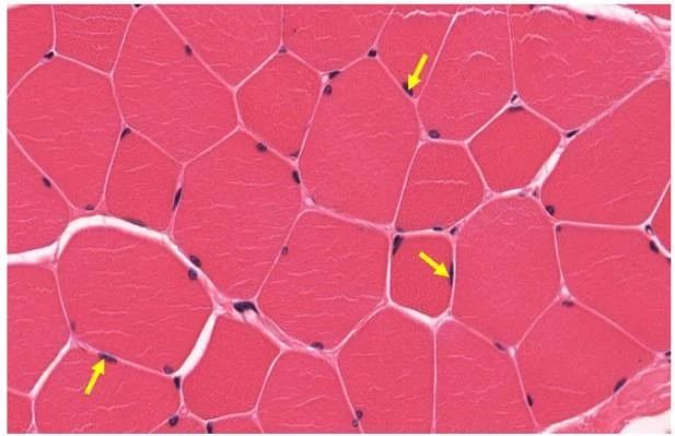 骨骼肌纤维横切面呈现为多边形断面,在肌纤维断面边缘,可见紧贴肌膜的细胞核(黄色箭头),部分断面中见多个细胞核。肌质呈现颗粒感,为众多肌原纤维的横断面