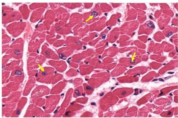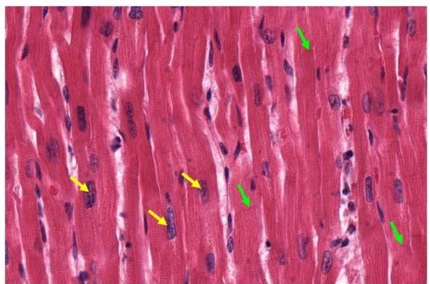 心肌纤维呈短圆柱形,有分支。细胞核卵圆形(黄色箭头),位于细胞中央,有些细胞含有双核。相邻心肌纤维连接处,可见着色较深的横行或阶梯状细线,为闰盘(绿色箭头)。心肌纤维有明暗相间的周期性横纹,不如骨骼肌明显。