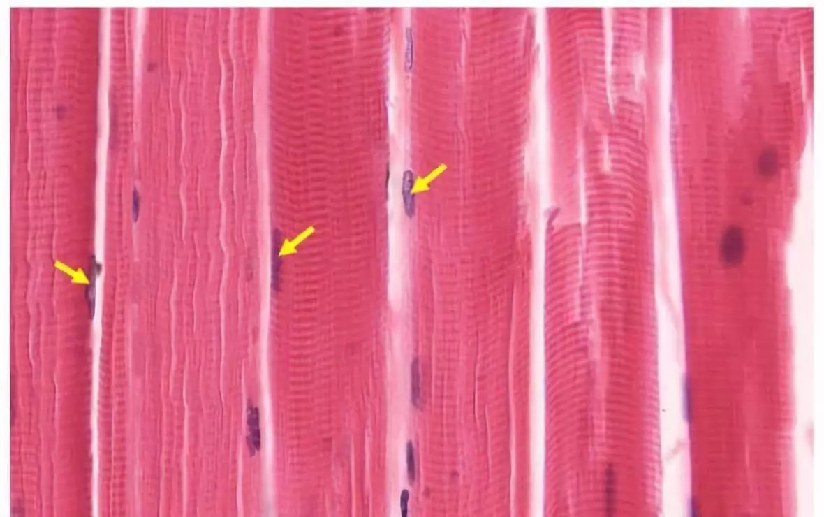 骨骼肌纤维长圆柱形,有横纹。一条肌纤维内见多个细胞核,细胞核呈扁椭圆形,异染色质少,染色较浅(黄色箭头)。肌质内含有许多与细胞长轴平行排列的细丝状肌原纤维。