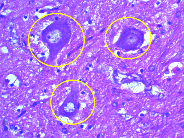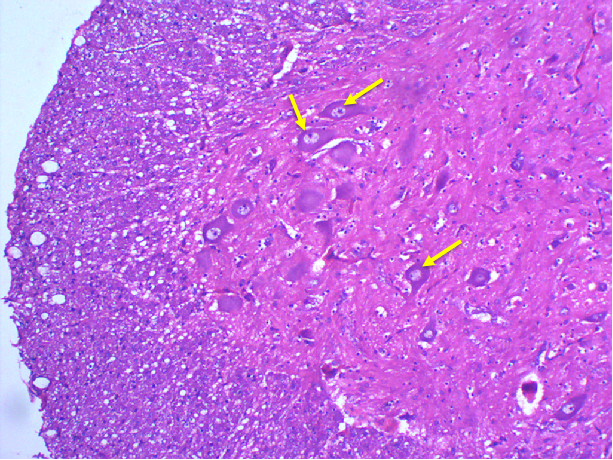 可见脊髓灰质前角运动神经元胞体大,有多个突起;细胞核大而圆,着色浅,核仁明显;细胞质内有粗大的斑块状结构即尼氏体,强嗜碱性,染紫蓝色。尼氏体除分布于胞体,亦可见树突内,但在轴丘和轴突内无尼氏体。