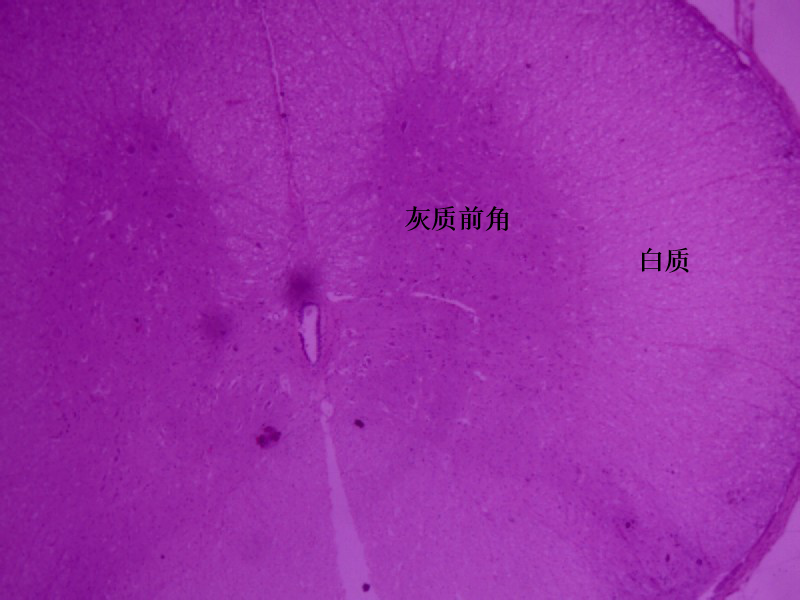图中可见脊髓内呈"H"形的染色深的灰质和周围的白质,每侧灰质的前角粗短,后角细长。