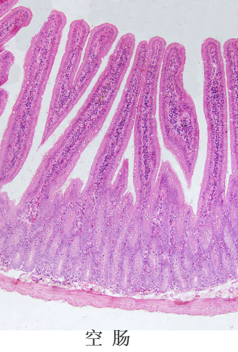 2.固有层在细密的结缔组织中除有大量小肠腺外,还有丰富的游走细胞,如淋巴细胞、浆细胞、巨噬细胞,嗜酸性粒细胞等。绒毛中轴的固有层结缔组织内有1~2条纵行毛细淋巴管,称中央乳糜管(central lacteal),它的起始部为盲端,向下穿过黏膜肌进入黏膜下层形成淋巴管丛。中央乳糜管管腔较大,内皮细胞间隙宽,无基膜,故通透性大。吸收细胞释出的乳糜微粒入中央乳糜管输出。此管周围有丰富的有孔毛细血管网,肠上皮吸收的氨基酸、单糖等水溶性物质主要经此入血。绒毛内还有少量来自黏膜肌的平滑肌纤维,可使绒毛收缩,利于物质吸收和淋巴与血液的运行。