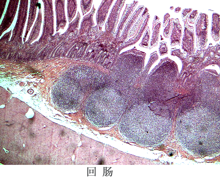 固有层中除有大量分散的淋巴细胞外,尚有淋巴小结。在十二指肠和空肠多为孤立淋巴小结,在回肠多为若干淋巴小结聚集形成的集合淋巴小结,它们可穿过黏膜肌抵达黏膜下层。