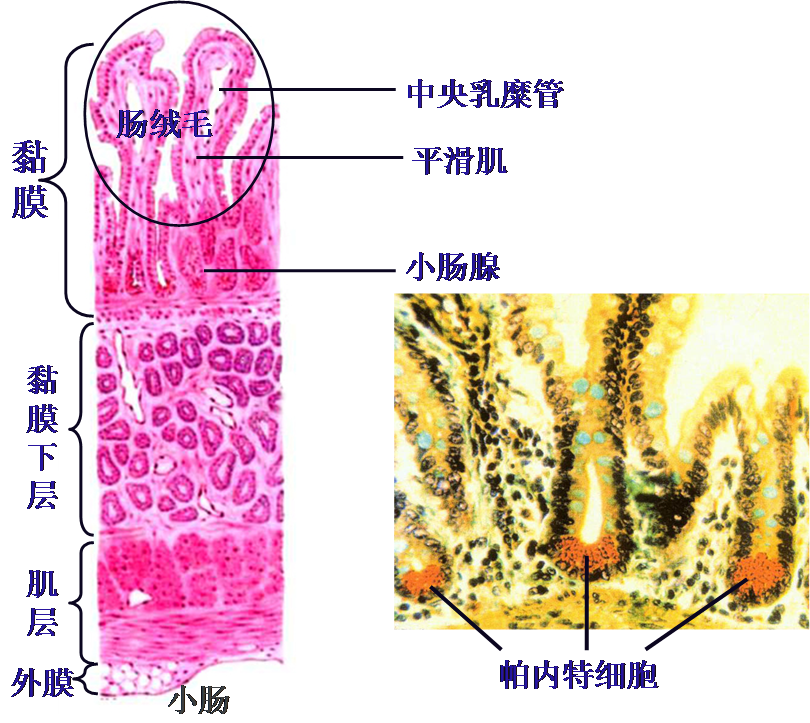 小肠黏膜由上皮、固有层和黏膜肌层构成。