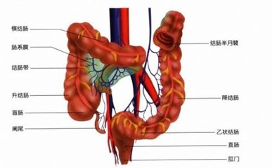 大肠,分为盲肠、阑尾、结肠、直肠和肛管 。大肠对食物残渣中的水分进行吸收,食物残渣形成粪便并有度排出。