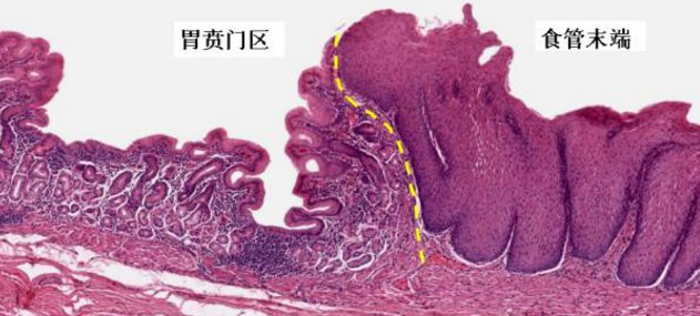 黄色虚线示交界处。可见右侧的食管黏膜的复层扁平上皮,陡然演变成左侧胃黏膜的单层柱状上皮。胃内容物反流会对食管黏膜造成慢性刺激(食管黏膜的抗酸能力不如胃黏膜),胃食管反流病,是食管癌发生的危险因素之一。