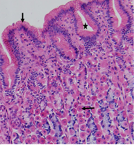 可见胃黏膜上皮为单层柱状上皮,除少量内分泌细胞外主要由表面黏膜细胞组成。该细胞柱状,细胞核位于基底部,顶部胞质充满黏原颗粒,染色淡。表面黏液细胞分泌含高浓度HCO3-的不溶性黏液,构成黏液-碳酸氢盐保护屏障,该屏障的破坏,可形成胃溃疡。固有层的胃底腺中可见嗜酸性胞质染成红色的壁细胞,壁细胞除了产生盐酸外,还分泌内因子,内因子可防止维生素B12的分解和并促进其吸收。内因子的缺乏(萎缩性胃炎,胃大部切除等情况),维生素B12缺乏,可致恶性贫血。