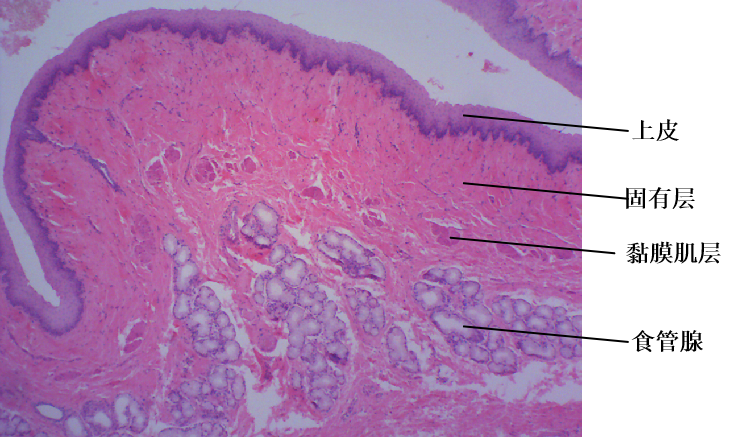食管壁四层结构。黏膜由上皮(复层扁平上皮)、固有层(细密的结缔组织)和黏膜肌层(纵行平滑肌)组成;黏膜下层为结缔组织,可见食管腺;肌层为内环外纵两层;外膜为纤维膜。