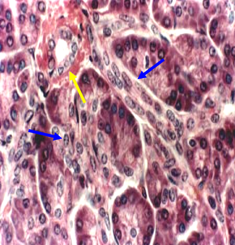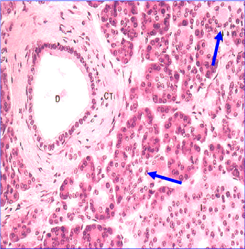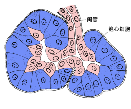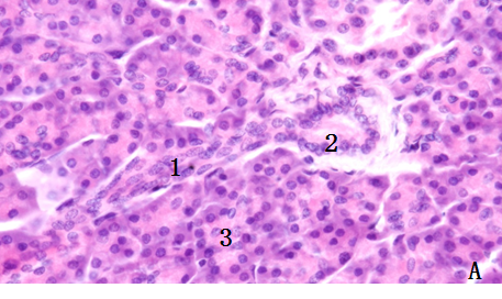 1. 腺泡:每个腺泡由40~50个锥体形腺细胞构成,腺细胞与基膜之间无肌上皮细胞。腺腔内有一些扁平或立方形细胞称泡心细胞(centroacinar cell),是延伸入腔内的闰管起始部上皮细胞。泡心细胞较小,胞质染色浅,核圆形。胰腺腺泡分泌多种消化酶,腺细胞还分泌一种胰蛋白的抑制因子,可阻止胰蛋白酶原在胰腺内激活,防止胰腺自溶。