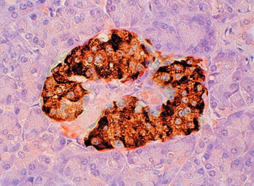 免疫组织化学染色(辣根过氧化物酶标记)示B细胞含胰岛素,呈棕黑色)