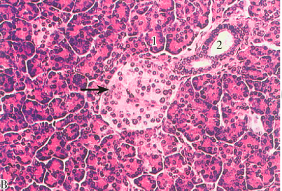 黑色箭头示胰岛;1.腺泡;2.小叶内导管