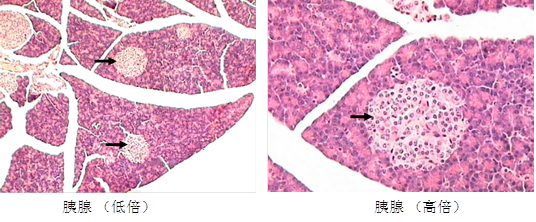 胰腺的内分泌部即胰岛(pancreatic islet),为分散在外分泌部之间的大小不等、形状不规则的细胞团,HE染色浅。胰岛细胞之间有丰富的毛细血管。胰岛主要有A、B、D、PP四种细胞。