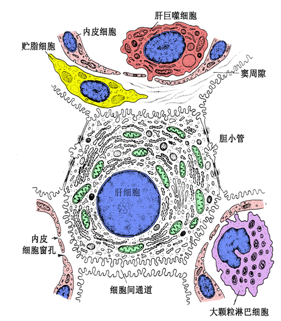4. 窦周隙:为血窦内皮与肝细胞之间的间隙,宽约0.4μm,窦周间隙内充满血浆,肝细胞微绒毛浸泡在血浆中,是肝细胞与血浆进行物质交换的场所。窦周隙内有贮脂细胞(fat-storing cell),贮脂细胞具有贮存维生素A和合成网状纤维的功能。慢性肝炎,慢性酒精中毒,贮脂细胞增殖过快,肝内纤维增多,都将导致肝硬化。