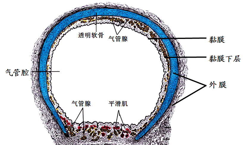 内含弹性纤维组成的韧带、平滑肌束和气管腺。咳嗽反射时平滑肌的收缩可使气管腔缩小从而清