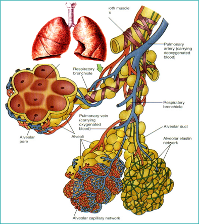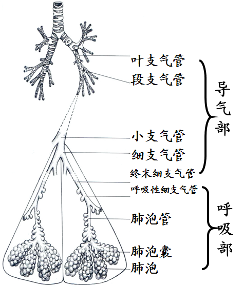 从主支气管到肺泡大约有24级分支。主支气管经肺门进入肺,顺序分为:叶支气管、段支气管、小支气管、细支气管、终末细支气管、肺泡管、肺泡囊、肺泡。其中,从叶支气管到终末细支气管为肺的导气部,呼吸性细支气管以下各段均出现的肺泡,为肺的呼吸部。