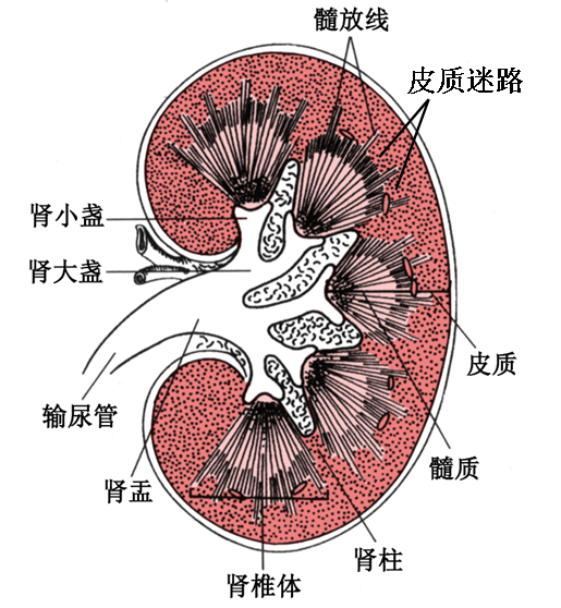 肾呈蚕豆,外侧缘隆凸,表面有被膜,肾实质分为皮质和髓质。髓质由10-18个肾锥体组成,肾锥体尖端钝圆突入肾小盏内,称肾乳头,肾锥体的底部与肾皮质相连,有从底端呈辐射状伸入皮质的条纹称髓放线,髓放线之间的肾皮质称皮质迷路,位于肾锥体之间的皮质称肾柱。一条髓放线及周围的皮质迷路组成一个肾小叶,一个肾锥体与相连的皮质组成一个肾叶。