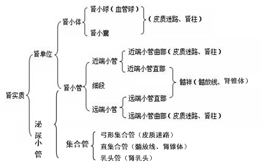 肾单位和集合管有规律的分布于肾实质内。弯曲部分位于皮质迷路和肾柱内,直行部分位于髓放线和肾锥体内,如下表所示: