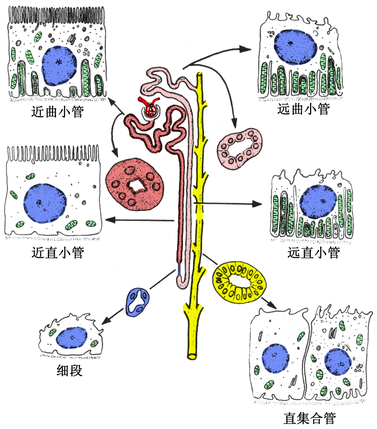图17-5 泌尿小管各段上皮细胞结构模式图