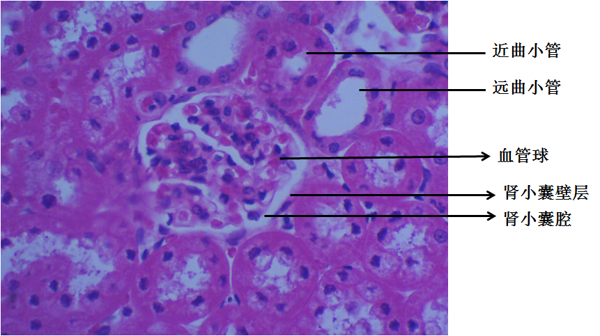 1、肾小体:散布于皮质迷路各处,断面呈圆形,由血管球和肾小囊组成。有的肾小体切面可见微动脉出入的血管极或与近曲小管相连的尿极。