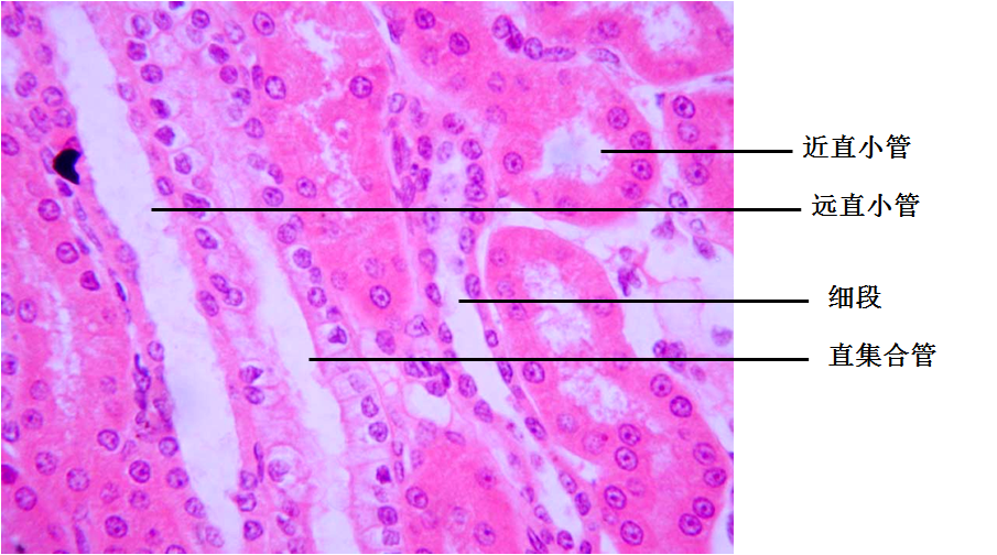 观察时应注意肾组织结构各部分(肾小体、近曲小管、远曲小管、细段、直集合管)分布的