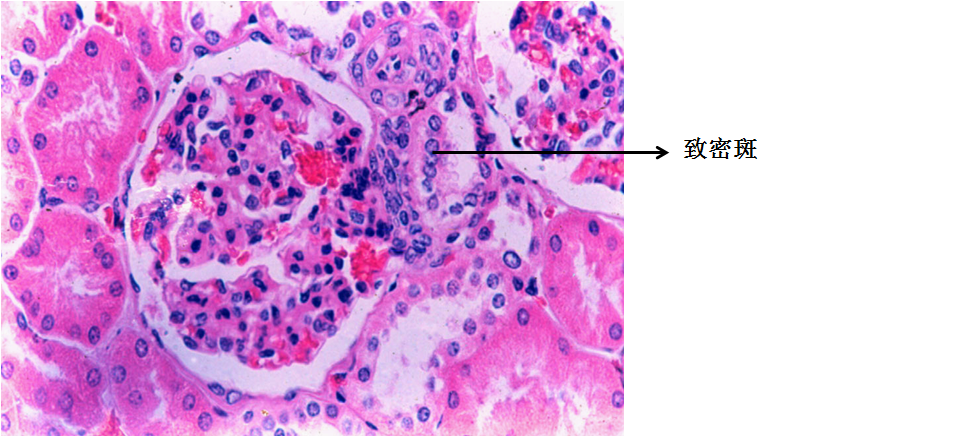 在皮质迷路内寻找有血管极的肾小体,此处可见靠近入球微动脉的远曲小管上皮细胞成柱状,细胞核密集且靠近腔面,此即致密斑。