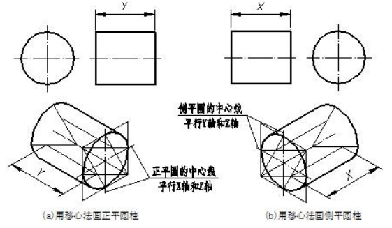 为了减少作图线,画圆柱下底面三段可见的圆弧时,可以从上底面的各圆弧的圆心(2、3、4)沿轴线方向量取圆柱两底面间距,直接得到下底面三段圆弧的圆心,然后用相应的半径画出下底面三段圆弧,这种作图方法称为“移心法”,如图 7-10(f)所示。图 7-11 所示是正平圆柱(底面为正平面)和侧平圆柱(底面为侧平面)的正等测,画法与上相同,可见底面用菱形法绘制,不可见底面用移心法画出。