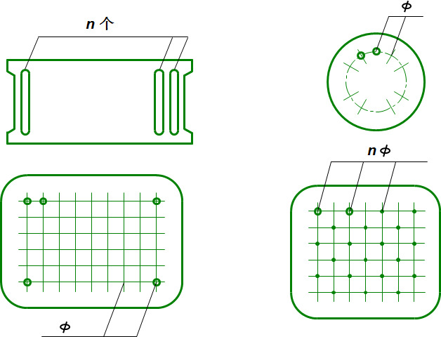 如果图上有多个完全相同而连续排列的构造要素,可仅在两端或适当位置画出其中一两个要素的完整形状,其余部以以中心线或中心线交点表示。