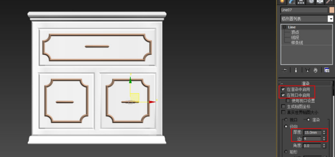 将视图切换为前视图,通过“创建——图形——线”的命令绘制柜体正面造型线,选择单个造型线,点击修改命令中“渲染”卷展栏,勾选渲染中启用和视口中启用,径向中厚度:15.0,边:4.0,调整位置,完成后的效果(如图2-52)。
