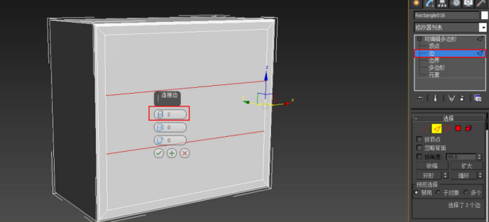 选择层级由“多边形”转换为“边”,按Ctrl键同时选择内框的左右线,右击点击连接左边的设置按钮,设置连接边分段数为2,完成后的效果(如图2-46)。