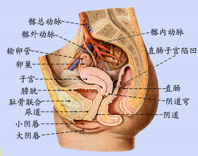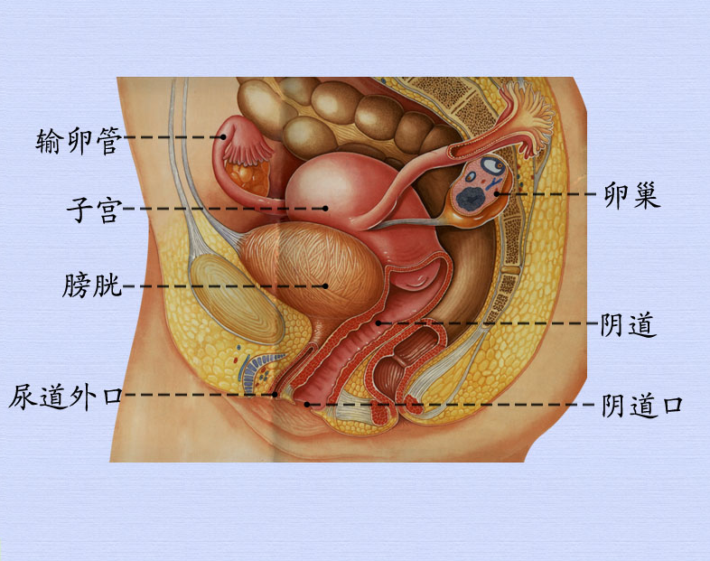 女性生殖系统由内生殖器和外生殖器两部分组成。女性内生殖器包括生殖腺(卵巢)、输送管道(输卵管、子宫、阴道)和附属腺(前庭大腺)三部分;女性外生殖器又称女阴,包括阴阜、大小阴唇,阴道前庭,阴蒂和前庭球。★
