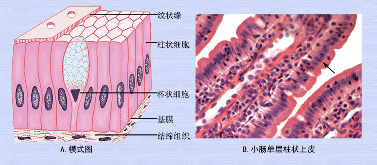 3.单层柱状上皮 由一层棱柱状细胞组成。有些单层柱状上皮的细胞之间有许多散在的杯状细胞,形似高脚杯,顶部膨大而充满粘液性分泌颗粒。单层柱状上皮分布于胃、肠、子宫和输卵管等处,具有保护、分泌和吸收功能。