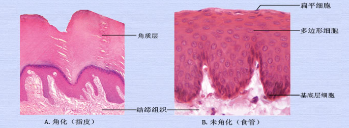 解析:复层鳞状上皮,又称复层扁平上皮,能在最表层形成角化层的称角化的复层扁平上皮,分布于皮肤表皮,不形成角化层的为未分化的复层扁平上皮,主要分布在口腔,食管和阴道黏膜。该上皮由多层细胞组成,侧面观基底层为低柱状或立方形细胞,具有旺盛的分裂增生能力,中间层为多边形和梭形细胞,表面为数层扁平鳞片状细胞。此上皮具有很强的机械性保护作用。