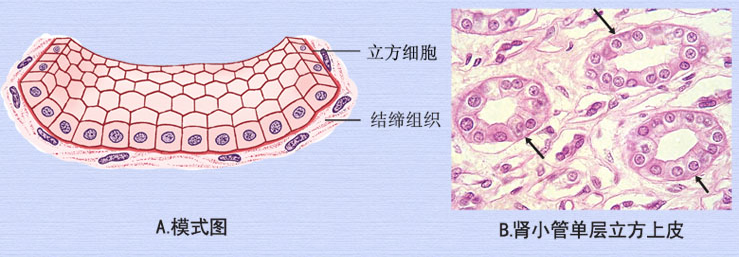 2.单层立方上皮 由一层近似立方形的细胞组成,主要分布于甲状腺、肝的小叶间胆管和肾小管等处,具有分泌和吸收的功能。