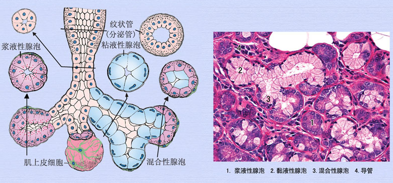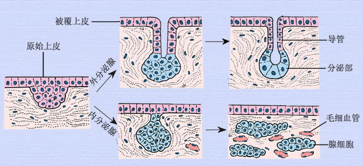 腺是胚胎时期由上皮细胞下陷到结缔组织中分化而成的。腺形成后,留有导管的腺称外分泌腺,如肝、唾液腺和汗腺等。无导管的腺称内分泌腺,如甲状腺、肾上腺和垂体等。外分泌腺由分泌部和导管两部分组成。