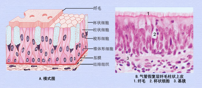 假复层纤毛柱状上皮主要分布于呼吸道粘膜。杯状细胞能分泌粘液,可以粘附尘粒,通过纤毛有节律性地向喉口方向摆动,并排出体外,对呼吸道有湿润和清洁保护作用。
