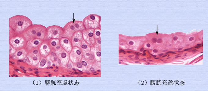6.变移上皮 又称移行上皮,由多层大小不等的细胞组成,细胞的形态和层数随器官容积的改变而发生相应的改变,故称变移上皮。当器官空虚时,器官壁变厚,上皮也变厚,细胞层次增多,此时浅层细胞呈大立方形,中层细胞为多边形,基底层细胞为矮柱状或立方形;当器官扩张时,器官壁变薄,上皮也变薄,细胞层次减少,细胞形态也变扁。变移上皮分布于肾盏、肾盂、输尿管和膀胱等处的粘膜,具有保护功能。