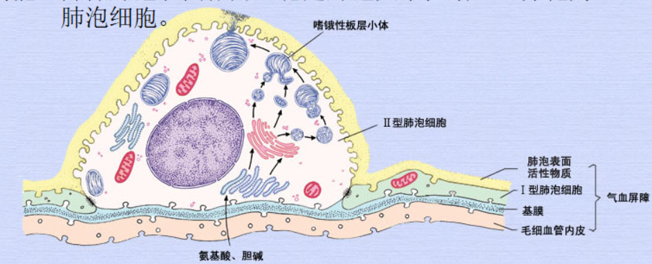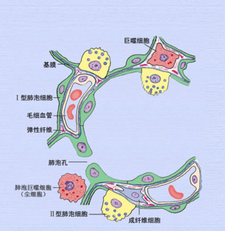 2.呼吸部:包括呼吸性细支气管、肺泡管、肺泡囊和肺泡。肺泡是半球形或多边形的囊泡,是气体交换的场所。肺泡上皮细胞有Ⅰ型和Ⅱ型两种,Ⅰ型肺泡细胞是构成肺泡壁的主要细胞;Ⅱ型肺泡细胞,数量少,能分泌肺泡表面活性物质,具有降低肺泡表面张力和稳定肺泡形态的作用。★★★