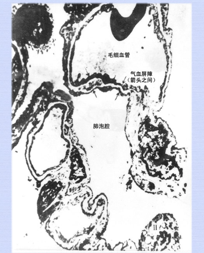 呼吸膜是指肺泡与血液之间进行气体交换所通过的结构,又称气血屏障。由毛细血管内皮细胞层、内皮基膜、肺泡与毛细血管之间的间质、肺泡上皮基膜层、肺泡上皮细胞层、含有表面活性物质的液体层,6层结构共同组成。★★
