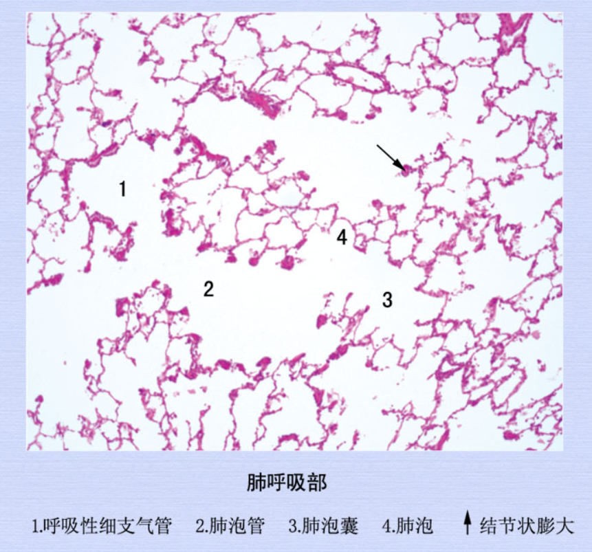 肺组织包括肺实质和肺间质,肺间质指肺内的结缔组织、血管、淋巴管及神经等结构,肺实质分导气部和呼吸部: