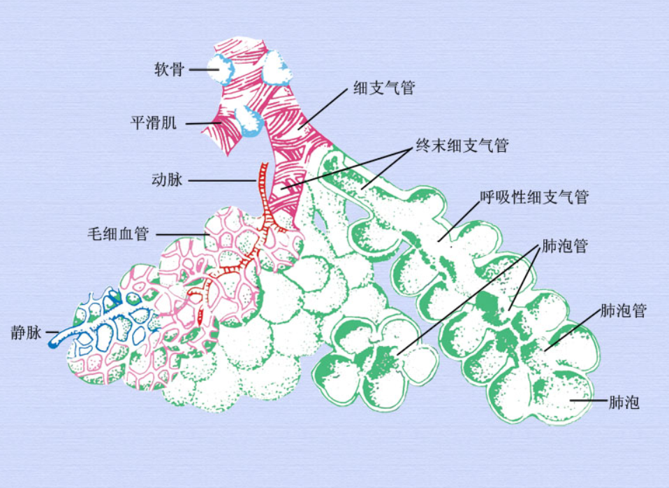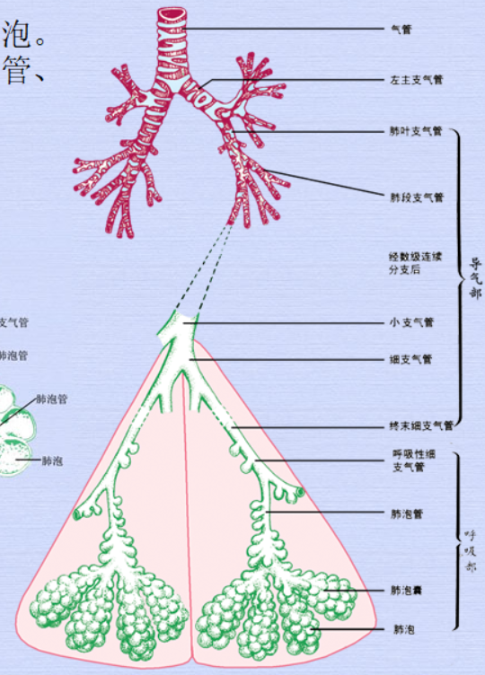 1.导气部:按管径由大到小分别为叶支气管、段支气管、小支气管、细支气管、终末细支气管,只输送气体,不能进行气体交换。