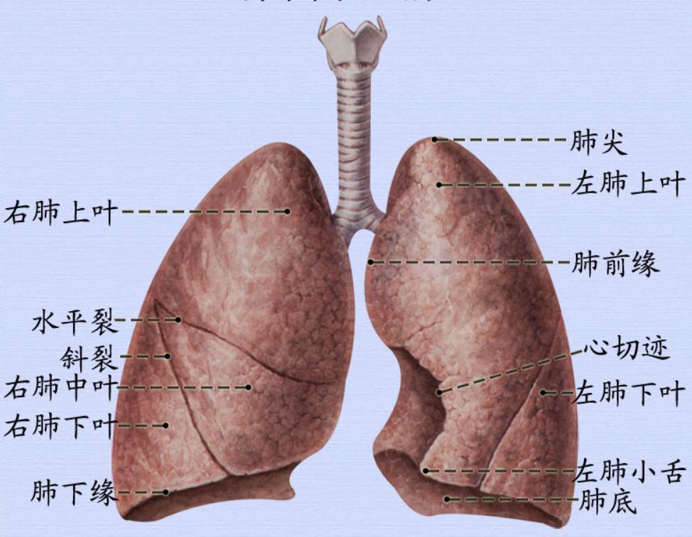 1.肺位于胸腔内,纵隔的两侧,左、右各一,新生儿的肺呈粉红色,随着年龄的增长,因空气中的灰尘不断沉积于肺,逐渐成灰暗,甚至成黑色。肺呈半个圆锥形,左肺狭长,分为上、下两叶;右肺粗短,分为上、中、下三叶,每个肺有一尖、一底、两面和三缘等结构。★★★