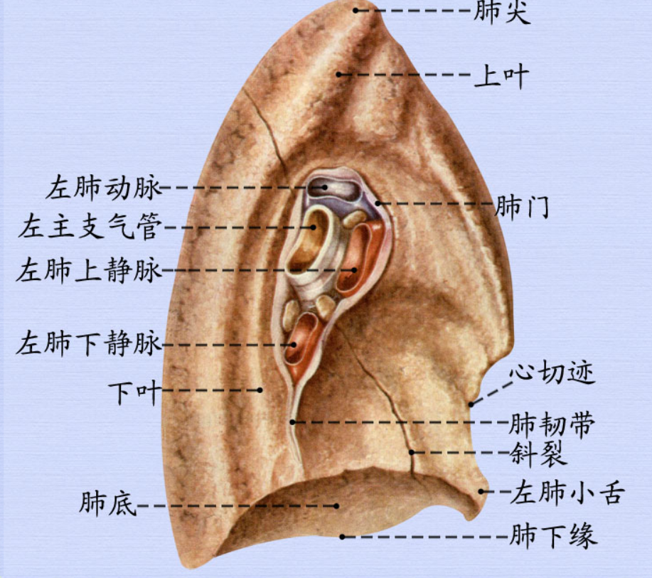 二面:指肋面和纵隔面。主支气管、肺动脉、肺静脉以及支气管动静脉、淋巴管和神经出入处称肺门,这些出入肺门的结构被结缔组织包裹称肺根。★★★